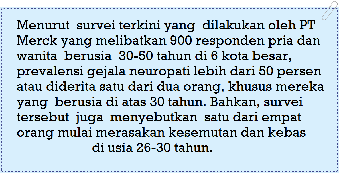 Neuropati merupakan istilah yang digunakan untuk kerusakan pada saraf atau gangguan saraf. Istilah ini memang belum di kenal luas oleh masyarakat kita. Penelitian yang dilakukan oleh Neurobion menunjukkan bahwa 90% masyarakat Indonesia belum tahu apa itu neuropati.
