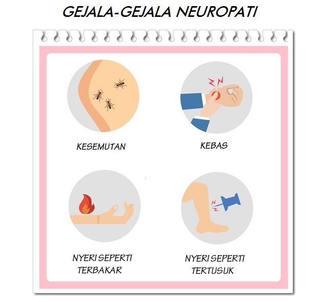 Gejala neuropati awalnya terlihat ringan. namun bila terjadi terus menerus dan tidak segera diatasi maka akan mengganggu aktivitas dan bisa menimbulkan masalah kesehatan yang serius. Karena itu, apabila gejala-gejala seperti kesemutan, kebas, kram atau nyeri dirasakan memberat dan tidak bisa hilang dengan treatment biasa, konsultasikan dengan dokter anda. Bila diperlukan dokter akan melakukan pemeriksaan lebih lanjut untuk memastikan penyebabnya.